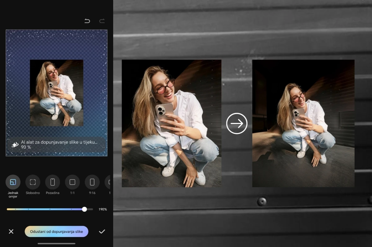 Ova opcija doslovno proširuje granice fotografije – inteligentno nadograđuje rubove slika, analizira stil, teksture i svjetlo na originalu i samostalno "dovršava" kadar onako kako bi to Lara sama učinila – samo bez dodatnog snimanja. Rezultat? Fotka je dobila širinu, prostor i savršenu kompoziciju – točno onako kako ju je Lara zamislila u glavi.