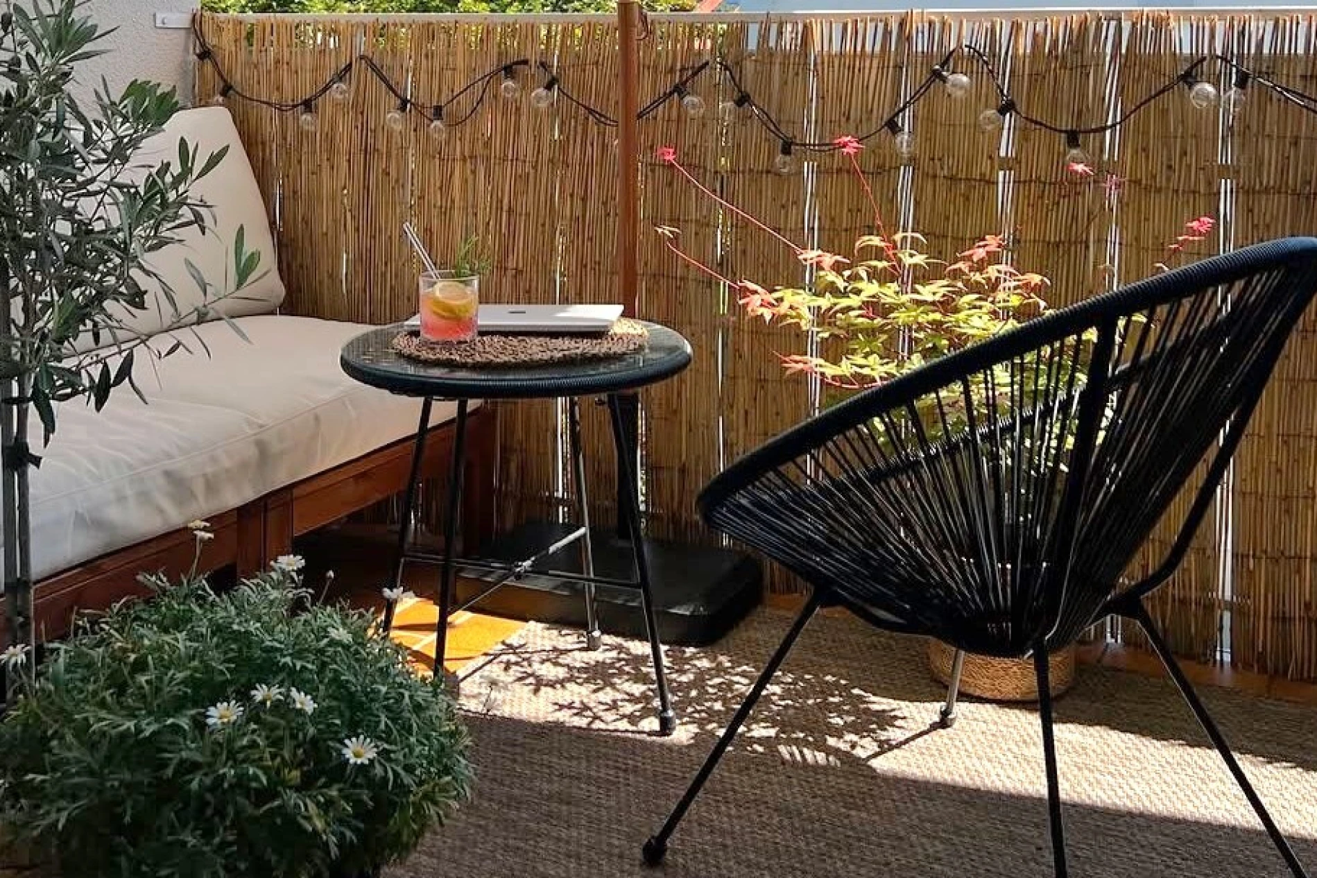 Ako želite i malo više privatnosti ili teksture na zidovima, preporučujemo bambusove pregrade koje vizualno zatvaraju balkon, a pritom izgledaju dekorativno i prirodno.