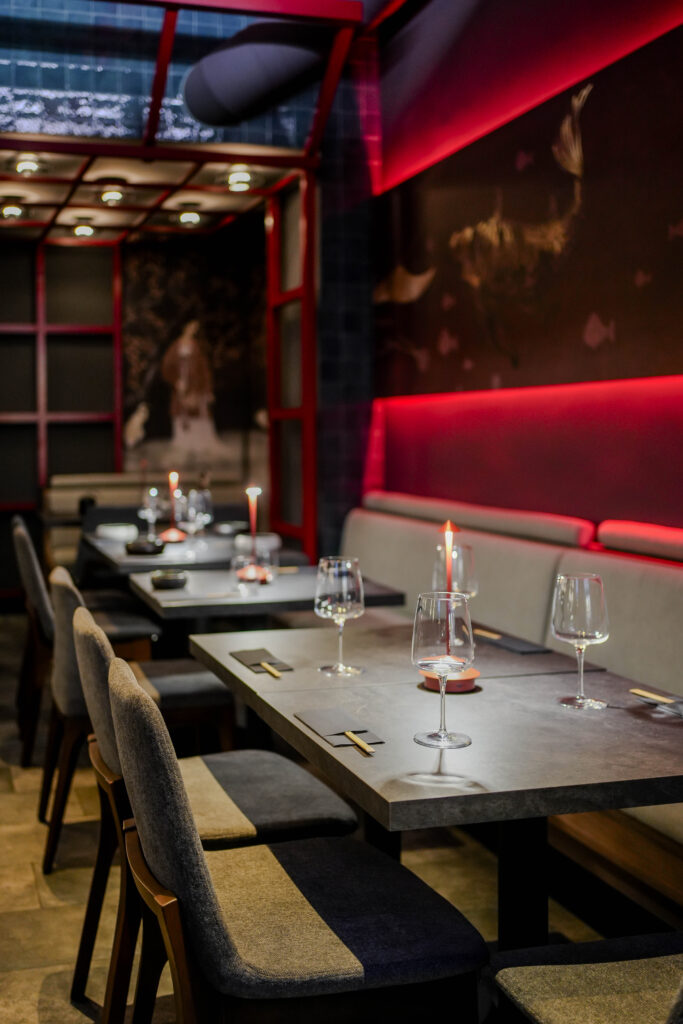 Za uređenje je zaslužan Denis Mašić koji je osmislio suvremenu verziju kineskog bistroa. Dominiraju tamni tonovi, crveni detalji i pažljivo birana rasvjeta koja stvara intimnu atmosferu. Nisko sjedenje i detalji inspirirani azijskom kulturom dodatno naglašavaju ideju dijeljenja hrane i opuštenog druženja za stolom. Sve je podređeno iskustvu: sporijem, svjesnijem uživanju u svakom jelu.