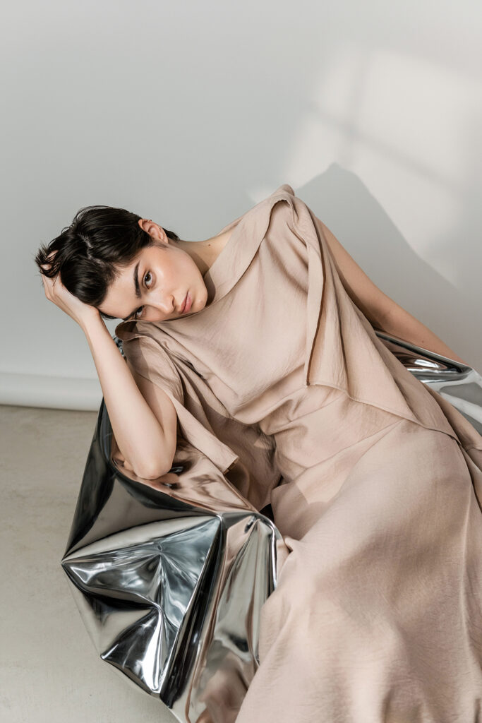 Posebna pažnja posvećena je odabiru materijala, gdje svaka tkanina nosi svoju ulogu u jeziku kolekcije. Svila se ističe preciznim padom i prirodnom lakoćom, nježno se prilagođavajući tijelu. Cupro, kao regenerirana celuloza, suptilno reagira na svjetlo mijenjajući svoj karakter s pokretom i promjenom ambijenta. Brušeni pamuk donosi taktilnu dimenziju: mekan, gotovo baršunast na dodir, s osjećajem koji nadilazi vizualni dojam. Prirodne i lepršave tkanine naglašavaju pokret i ugodu nošenja, oblikujući komade koji djeluju lako, ali s jasnom namjerom odražavajući ženstvenost koja je istovremeno prizemljena i izražajna, smirena i samouvjerena.