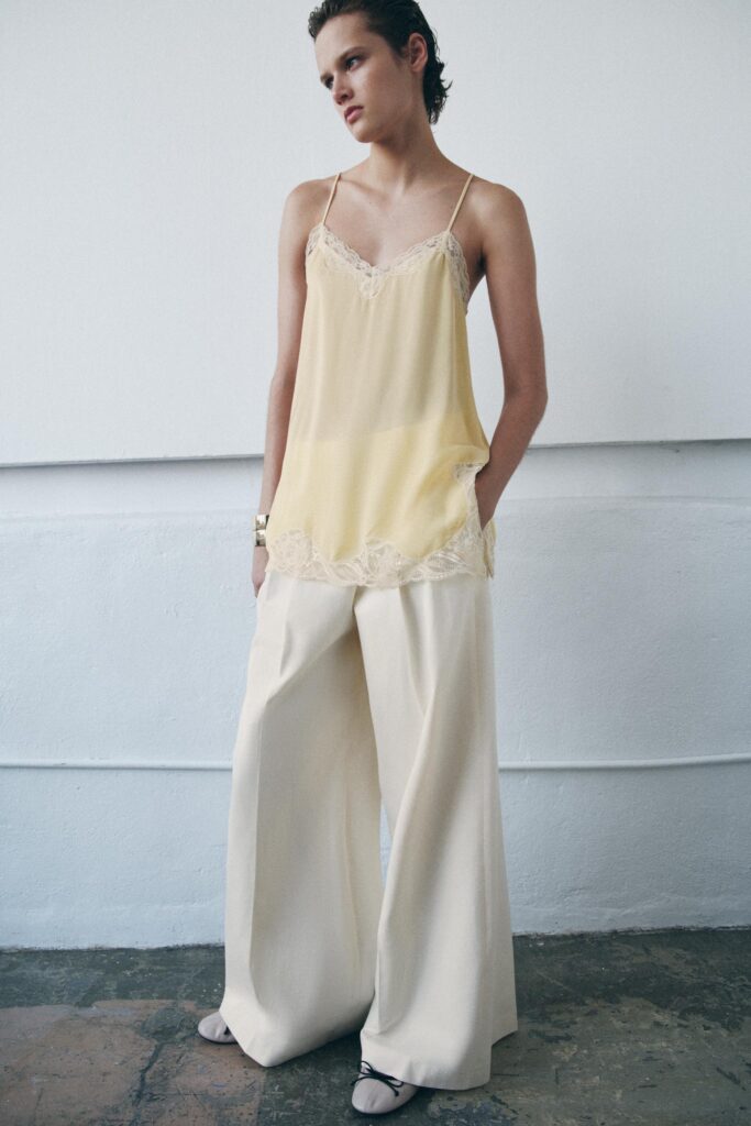 Tijekom jeseni najpopularniji modni komad bile su majice i bluze s detaljem čipke na rubu, a situacija se uopće nije promijenila ni ove godine. Najviše su se istaknule bluze s tankim naramenicama u opuštenom stilu, a trendi djevojke nosile su ih preko traperica, hlača i suknji. Detalj čipke koji lagano viri još uvijek je u trendu, a Zara sniženje u ponudi ima prekrasan model u maslac žutoj boji s detaljem bijele čipke. Početna cijena ove bluze bila je 29,95 eura, a sada je 17,99 eura.