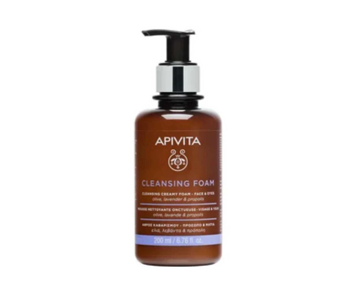APIVITA pjena za umivanje lica i područja oko očiju sadrži 93% prirodnih sastojaka te s pomoću masline i lavande uklanja nečistoću na licu. Namijenjena je svakom tipu kože.