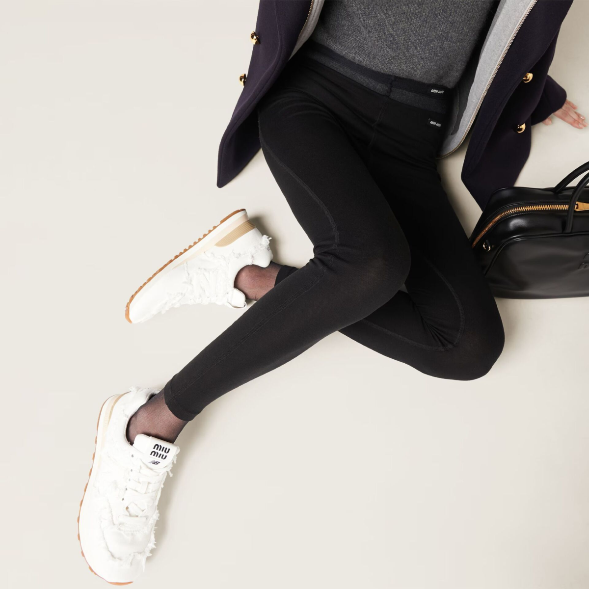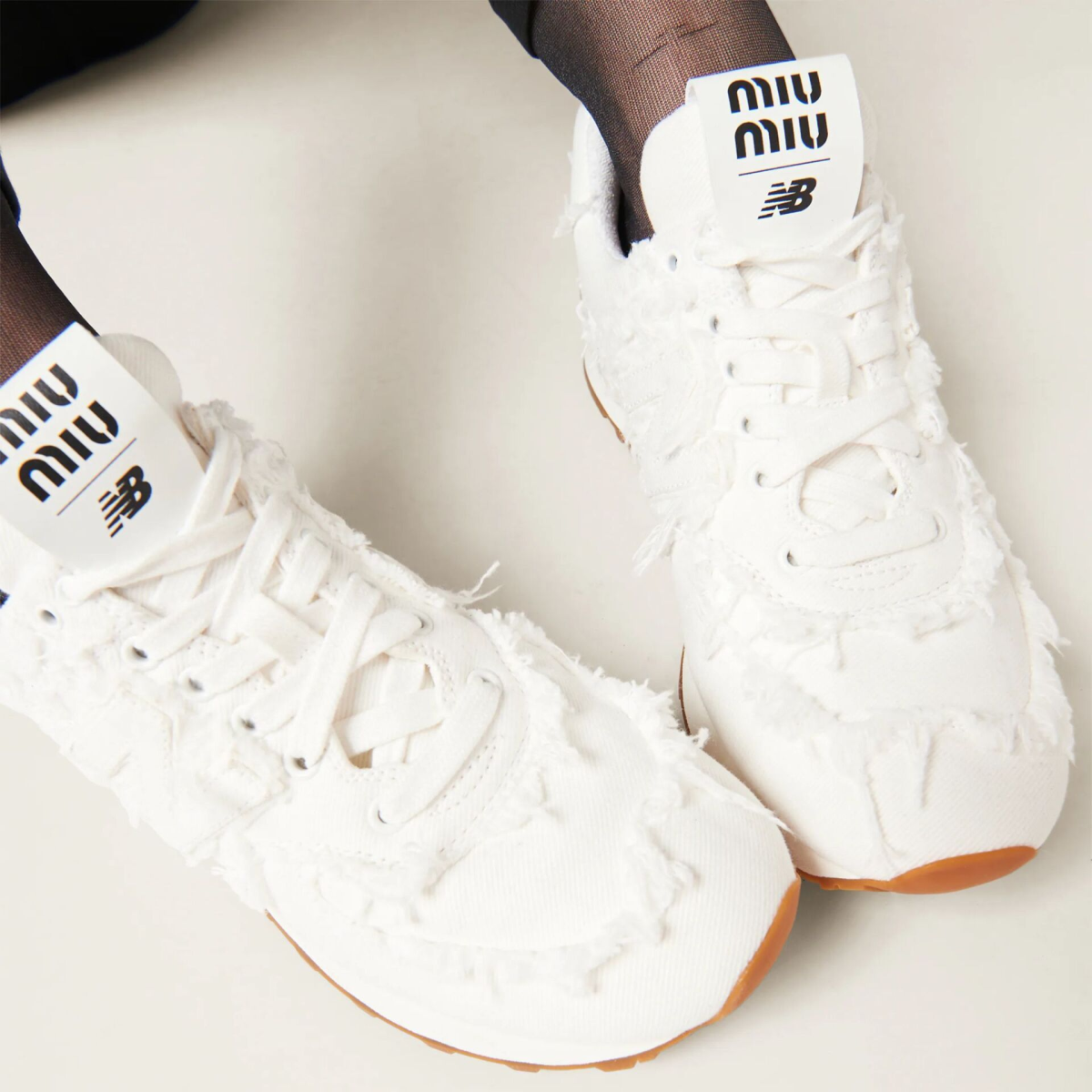 Radi se o New Balance 574 modelu, koji je zahvaljujući trenutno najpopularnijem modnom brendu, Miu Miu, dobio novi život. Njihova verzija tenisica uključuje zanimljive drapirane detalje napravljene od traper materijala. Tenisice s nešto povišenim podplatom krase i logotipi brendova, dva na prednjem i jedan na stražnjem dijelu, kao i jednostavne bijele vezice koje ih čine savršenim cipelama za svakodnevno nošenje.