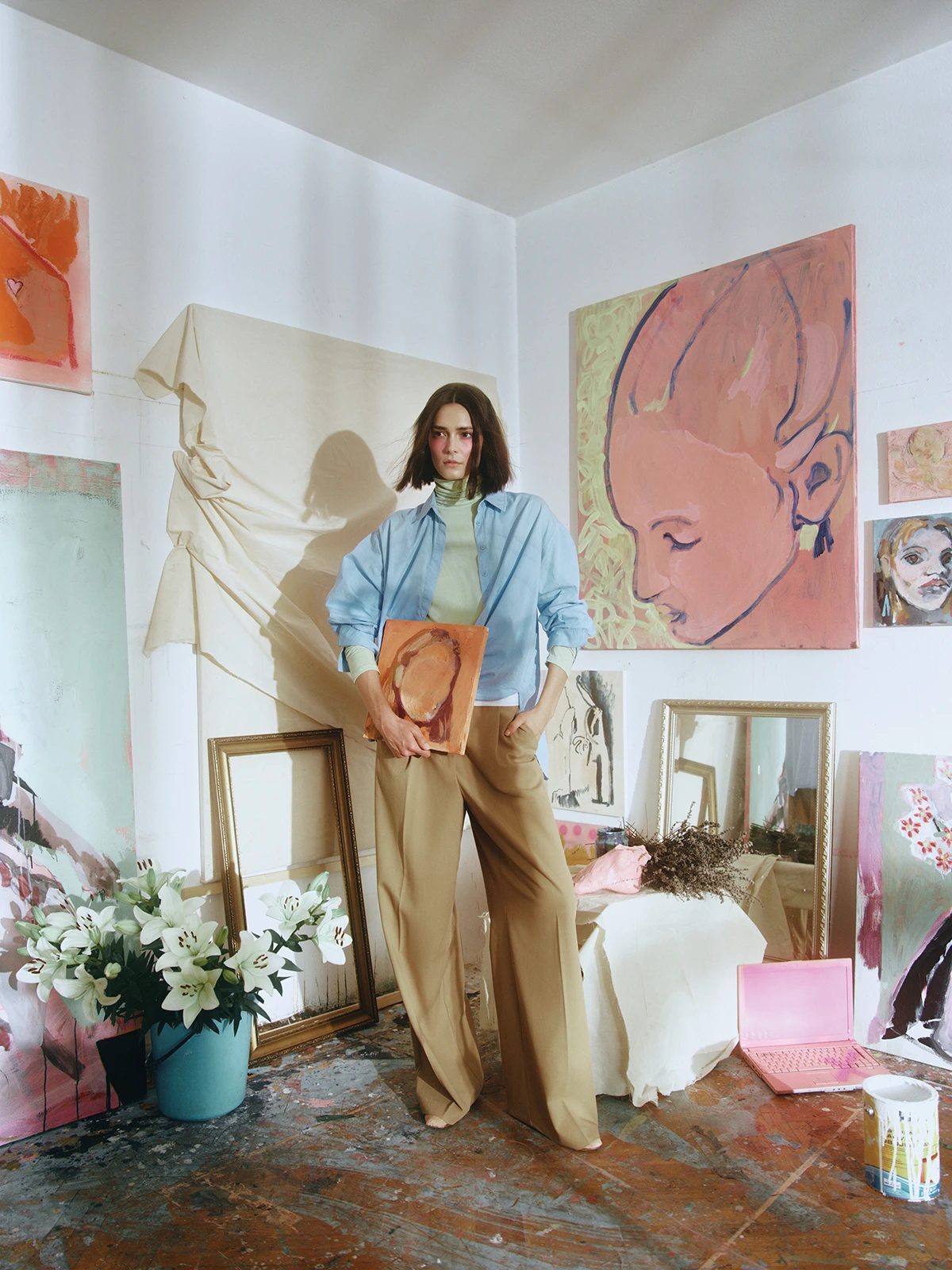 Dok namješta set za savršen kadar, predlaže da model u rukama drži oslikan laptop, sav u ružičastom. Laptop zbog te boje koja, iako pink, djeluje strastveno, naneseno u gustim potezima, dakako, više nije u funkciji. Hana često propituje tehniku kojom danas komuniciramo. Mobiteli. Laptopi. Ekrani. „Inspiraciju crpim iz svakodnevnih trenutaka koji oblikuju našu stvarnost, od intimnih iskustava do utjecaja digitalnog svijeta na našu percepciju sebe. U posljednje sam se vrijeme možda osjećala možda malo isključeno iz svijeta u kojem sam se osjećala udomaćeno, puno sam vremena provela sama s mobitelom ili laptopom gledajući svijet kroz njih. Oni su i prije bili neki motivi koje sam propitivala, ali sada su postali atributi u mojim autoportretima. Mislim da će nas za x godina naši potomci zamišljati s mobitelom u rukama, kao da su postali ekstenzija naših udova.“