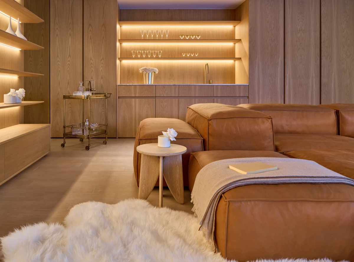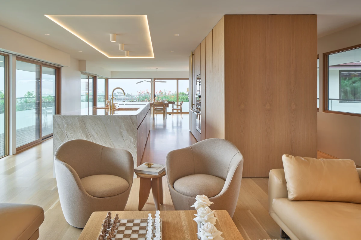 Veliku ulogu u dizajnu imao je odabir materijala - interijer je oplemenjen prirodnim mramorom i bijelim hrastom, koji prostoru daju toplinu i osjećaj smirenosti. Svjetlosna igra između velikih prozora, LED rasvjete i pažljivo odabranih nijansi doprinosi stvaranju umirujuće atmosfere. Prostrani, otvoreni tlocrt osigurava lakoću kretanja, dok su univerzalni dizajnerski elementi poput pristupačnosti za invalidska kolica i ugrađenog lifta ključni za inkluzivnost doma.