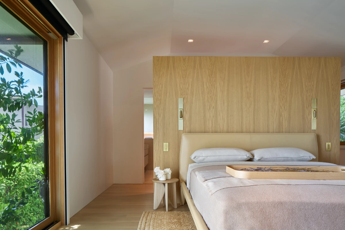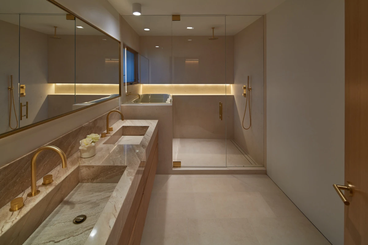 Ova kuća nije samo estetski privlačna - ona je i funkcionalna, prilagođena potrebama svojih vlasnika u svakoj fazi života. Svaki detalj pomno je osmišljen kako bi pružio osjećaj lakoće i ugode. Ručno izrađeni ormarići od ekološkog bijelog hrasta, mramorni umivaonici i prilagođeni komadi namještaja stvaraju sofisticiranu, ali nenametljivu atmosferu.