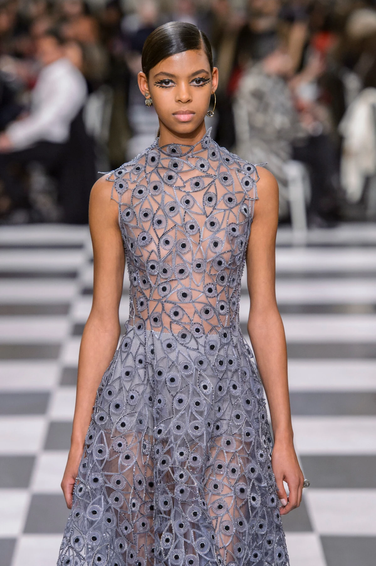 Dior couture haljina, koja je prvi put prikazana na reviji za proljeće 2018., na sebi ima interesantan detalj grafičkog oka i zjenice. Kao takva, već spada u znatno pomaknutije kreacije Marie Grazie Chiuri za Dior.