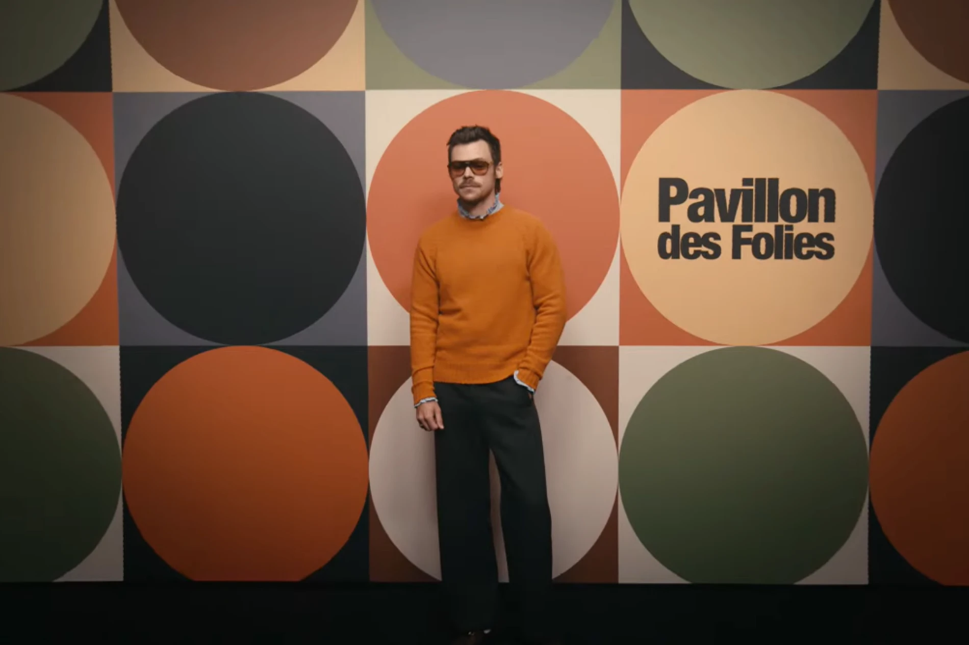 Harry je nosio svijetlo narančasti pulover ukrašen suptilnim „V“ logom, a ovaj naizgled jednostavan komad, glazbenik je upotpunio plavom košuljom čiji je ovratnik s volanima suptilno provirivao ispod pulovera. Kombinaciju je upotpunio s klasičnim sivim hlačama, smeđim mokasinama, bijelim čarapama i predimenzioniranim avijatorkama koje su dodale dozu holivudskog glamura njegovom odmjerenom izgledu.