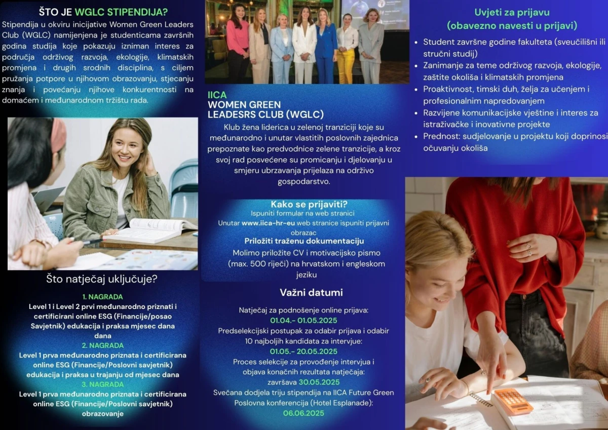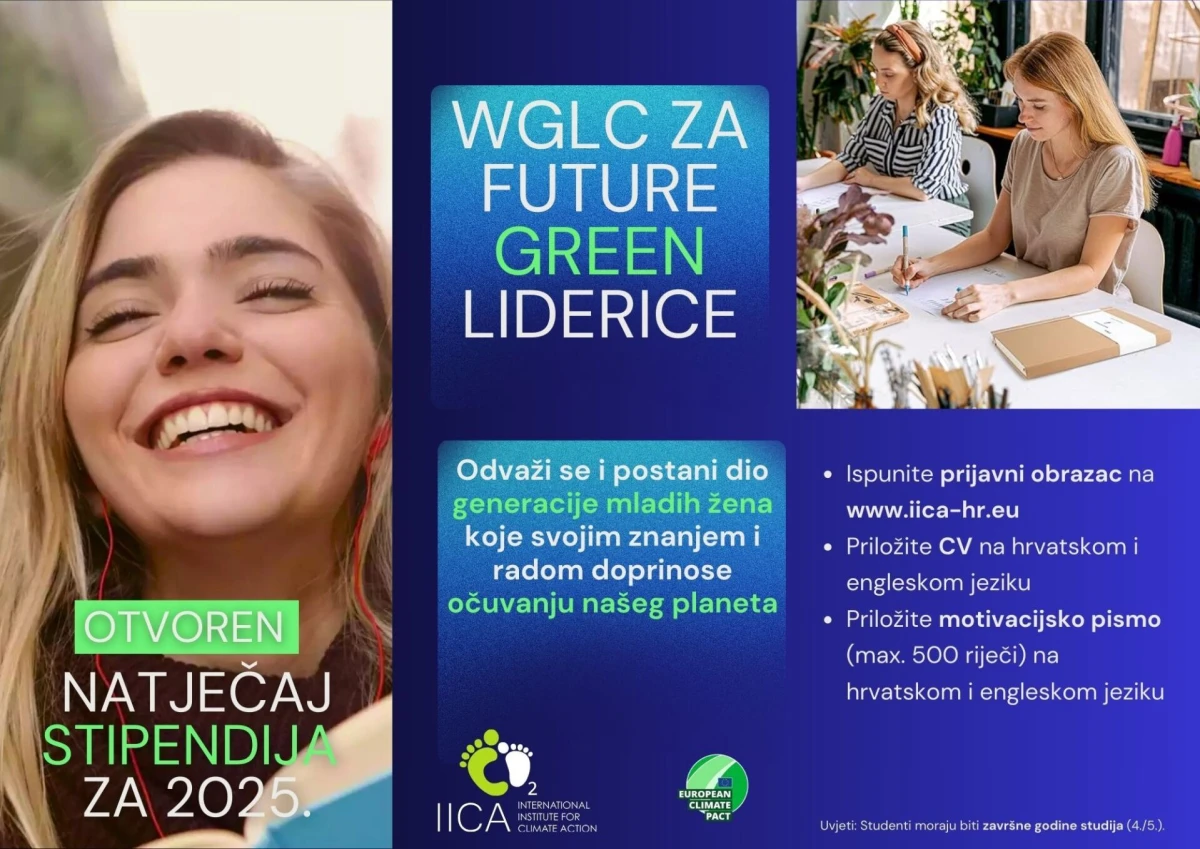 Međunarodni institut za klimatske aktivnosti (IICA), zajedno sa svojim Women Green Leaders Club (WGLC), koji se sastoji od poznatih i priznatih liderica zelene tranzicije, objavljuje natječaj za stipendije pod nazivom „WGLC za Future Green Liderice“, namijenjen studenticama završnih godina fakulteta s izraženim interesom za teme održivog razvoja, ekologije, zaštite okoliša i klimatskih promjena. Natječaj traje od 1. travnja do 1. svibnja 2025. godine.