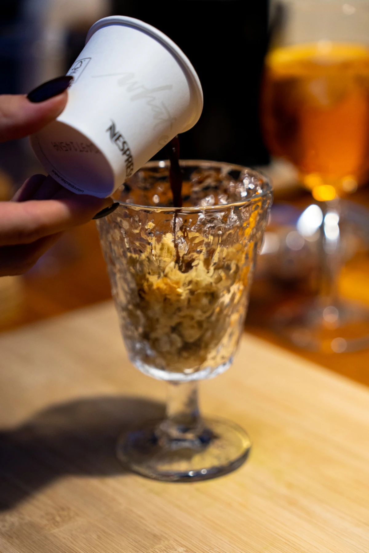 Servirajte slasticu tako da na dnu čaše stavite crumble od lješnjaka, zatim Nespresso kavu, pa liker od lješnjaka te na sve stavite kremu od mascarponea i agruma. Ukrasite kandiranim koricama limete i naranče ili klicama meda.