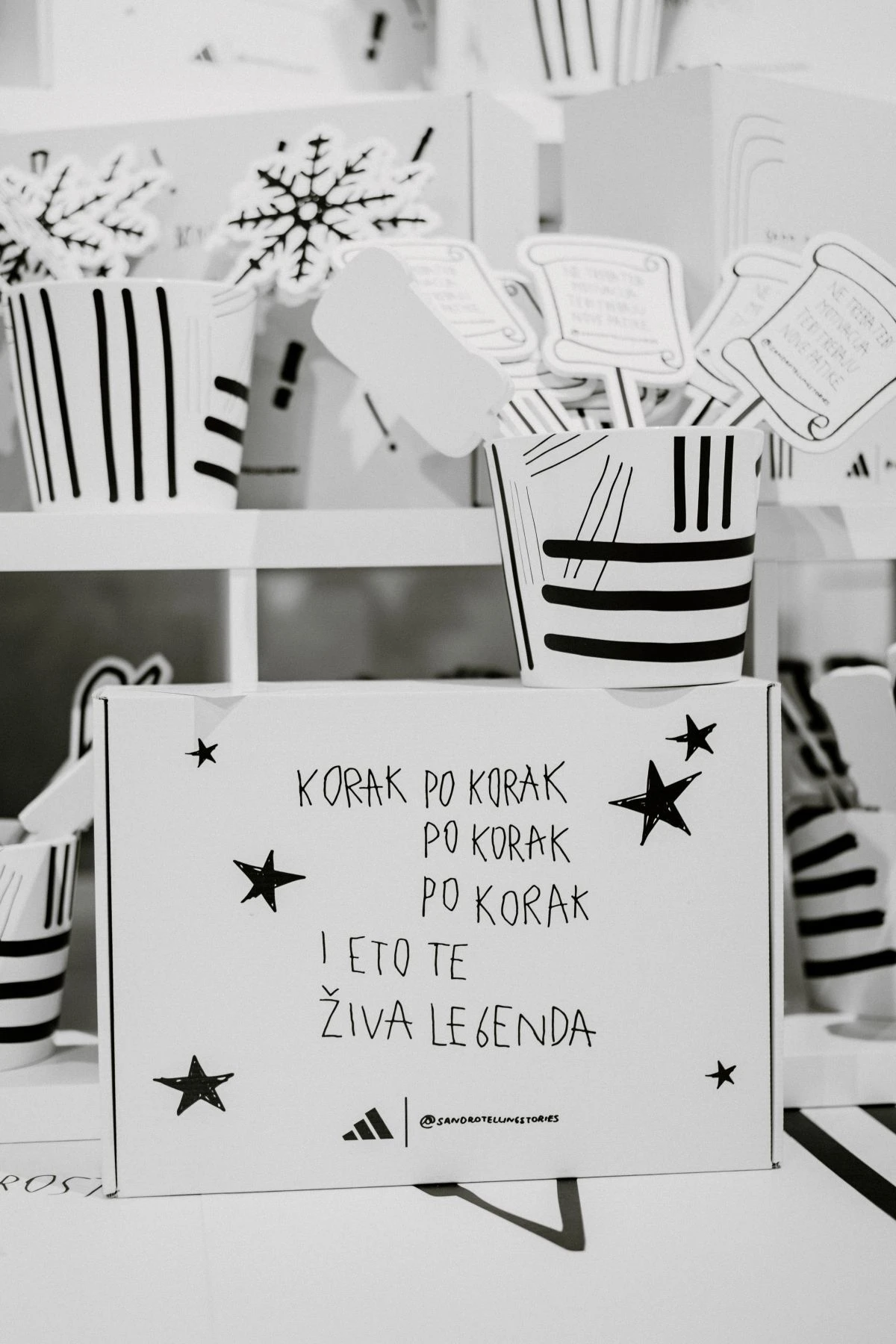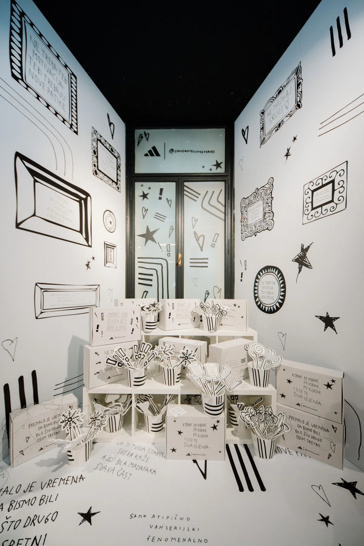Poruke poput „Ne mozgaj, srcuj“, „Ne treba tebi motivacija, tebi trebaju nove patike“ i „Ne hodaj po zemlji kada možeš letjeti“ pronašle su svoje mjesto na zidovima trgovine, a osim atraktivnog interijera, adidas je uz svaku kupnju za sve kupce pripremio i kutije ukrašene Sandrovim porukama što predstavlja genijalno i jedinstveno pakiranje za poklone ovih blagdana.