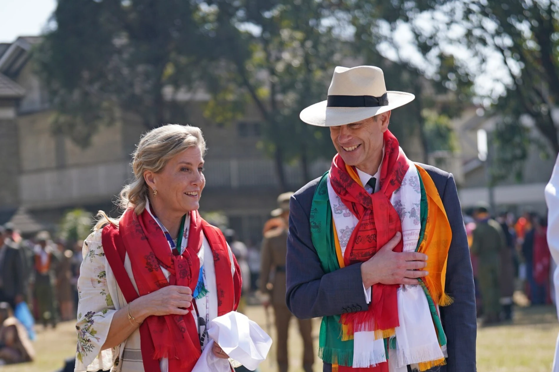Sophie i princ Edward prisustvovali su svečanoj dobrodošlici u Predsjedničkoj palači, gdje su ih dočekali nepalski predsjednik Ram Chandra Paudel i prva dama Sabita Paudel. Za ovu prigodu, Sophie je odabrala još jedan cvjetni outfit, ovaj put satensku haljinu poznate dizajnerice Mary Katrantzou. Haljina, ukrašena hrabrim uzorkom jasmina i akcentima u tirkiznoj boji, savršeno se uskladila sa živopisnim cvjetnim aranžmanima koji su ukrašavali prostor gdje se održavao kraljevski susret.