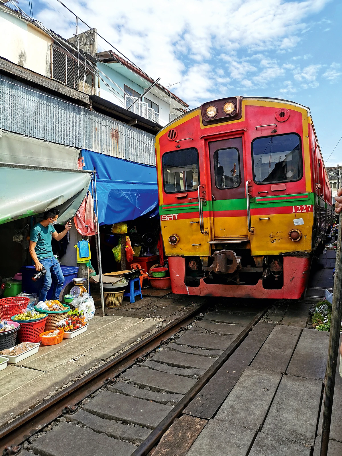 Kada se vlak približi (lokalni vlak koji povezuje okolna mjesta s Bangkokom), prodavači brzo povuku svoje suncobrane i pomaknu robu koju prodaju s pruge, čime oslobađaju prostor za vlak. Čim vlak prođe, ponovo postavljaju robu i suncobrane, a tržnica se vraća svakodnevnoj gužvi. To je fascinantan proces jer ne samo da doživite živahnu atmosferu ove neobične tržnica, nego imate priliku vidjeti kako se tržnica prilagođava i zaustavlja da bi se omogućio prolazak vlaka.