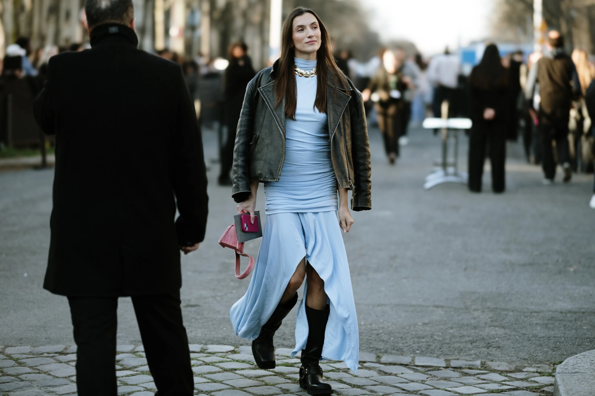 Klasična kombinacija koja nikada ne izlazi iz mode je ona s trapericama i balerinkama, no ako želite nešto elegantniji pristup kožnoj bomber jakni, kombinirajte je s lepršavom midi haljinom i gležnjačama. Ovaj kontrast između elegantne haljine i robusne kožne jakne stvara efektan i boho look koji je idealan za rano proljeće. Iako ne izgleda tako, može se lako prilagoditi i poslovnim kombinacijama. Nosite je preko elegantnih hlača visokog struka i košulje za moderan uredski outfit ili preko moćnog odijela. Dodajte ovom looku i kitten štikle ili modernu maramu oko vrata.